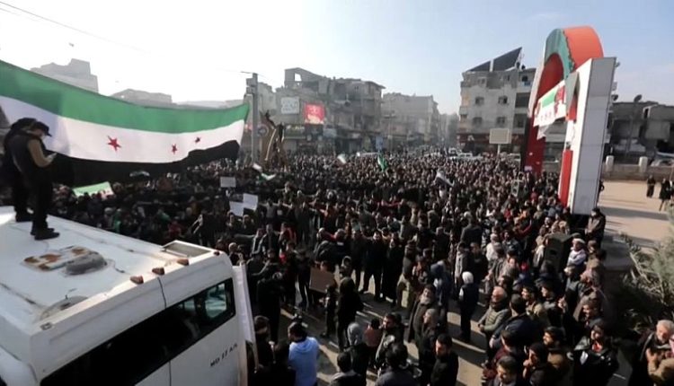 خرج المئات من السوريين أمس في مسيرة عفوية احتجاجا على التقارب المحتمل بين تركيا وسوريا في بلدة الباب التي تسيطر عليها المعارضة السورية، شمال سوريا.